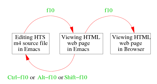 Due to some cleverness invented by myself it is possible to easily navigate between H.T.S. m4 source files and their resulting H.T.M.L. files and the Web browser. The key F10 goes from H.T.S. files to H.T.M.L. files and from there to showing the file in a Web browser. Conversely the keys Ctrl-F10, Alt-F10 and Shift-F10 go in the opposite direction from H.T.M.L. files to H.T.S. files. The following diagram should explain how this works: